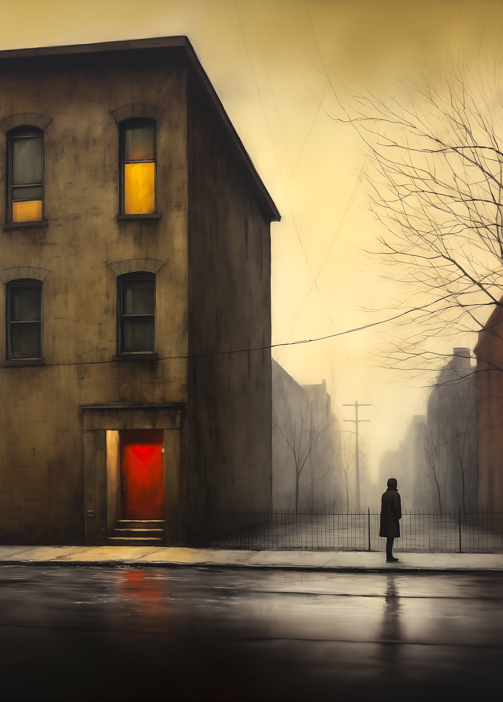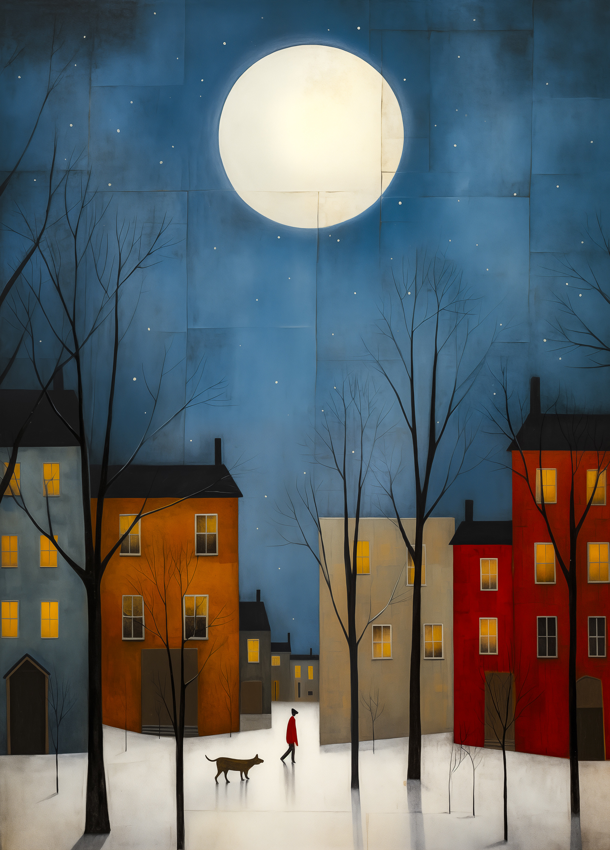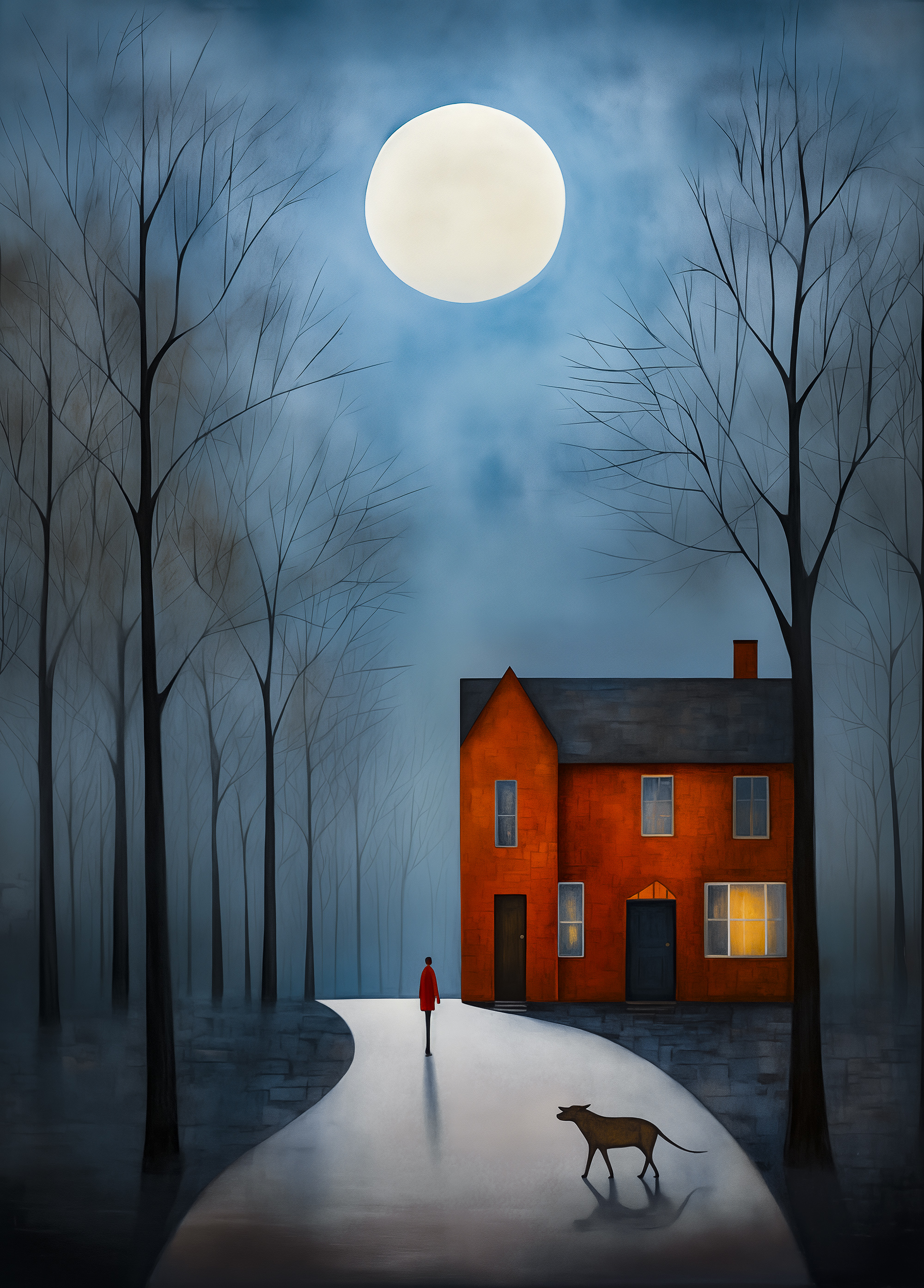 At first glance, this appears to be a classic scene; but on closer inspection, things are a little askew. The house sits a bit too close to the road, the light in the window appears to come from the outside, the moon seems almost too large, and, upon closer look, the animal in front is neither a cat nor a dog. Something feels out of frame - or perhaps something is happening just beyond it.